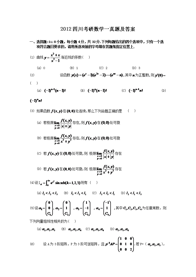 【文档名称】 2012四川考研数学一真题及答案(Word版).doc