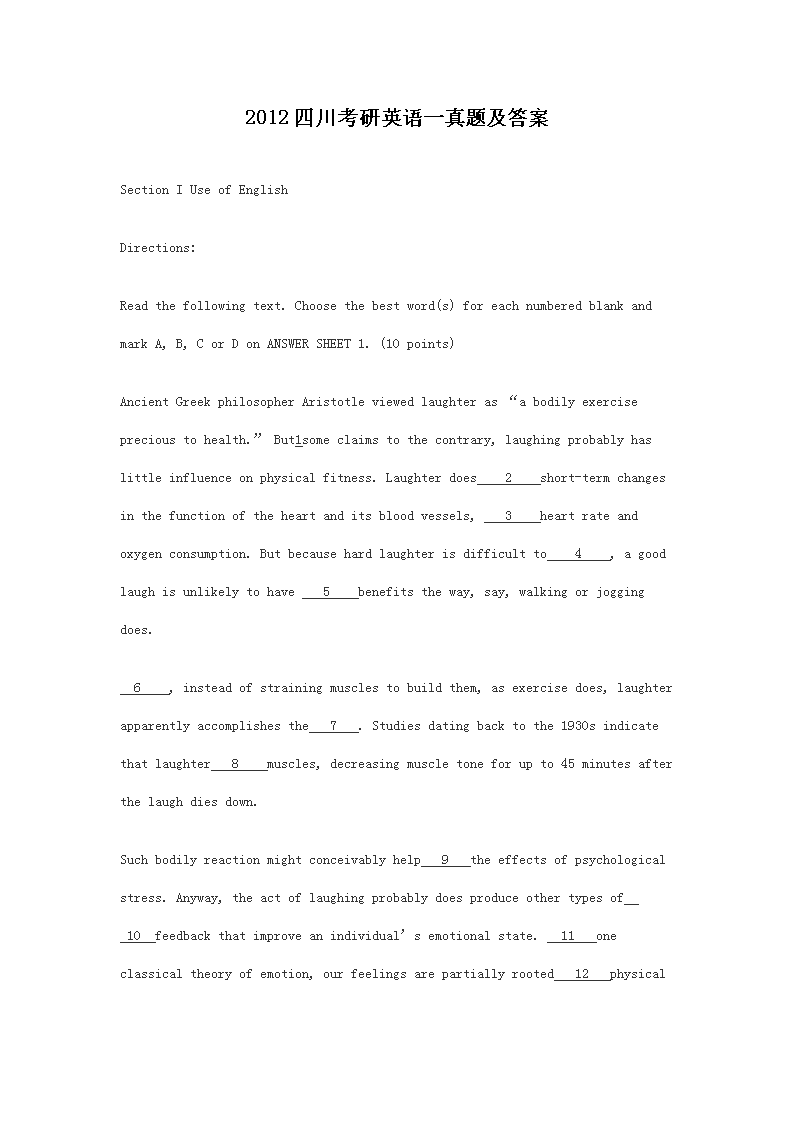 【文档名称】 2012四川考研英语一真题及答案(Word版).doc
