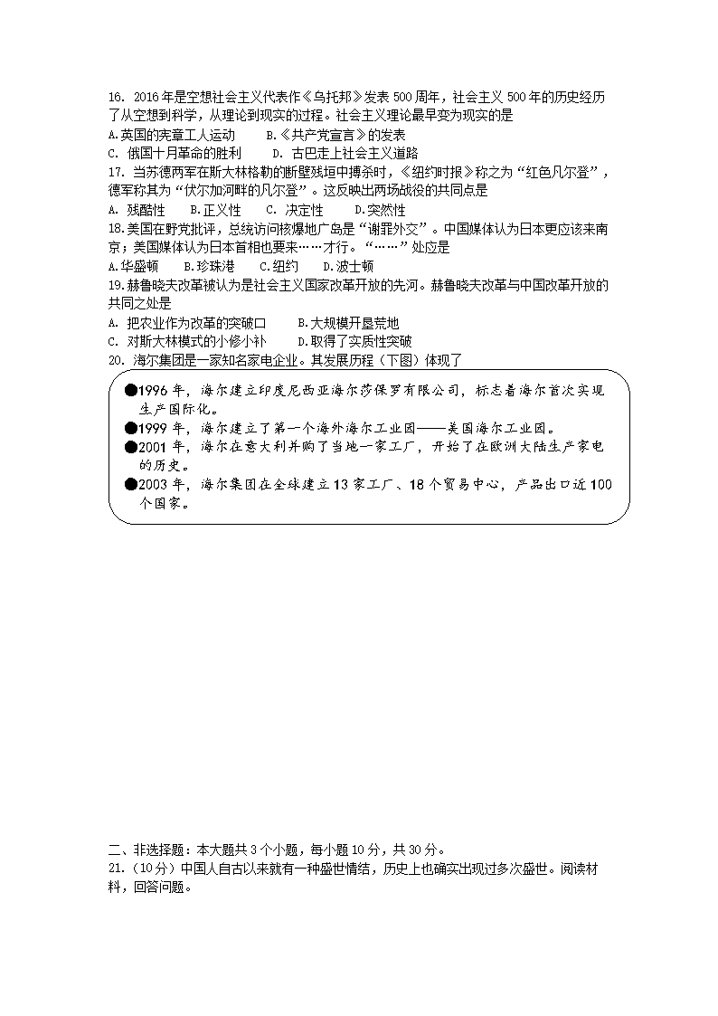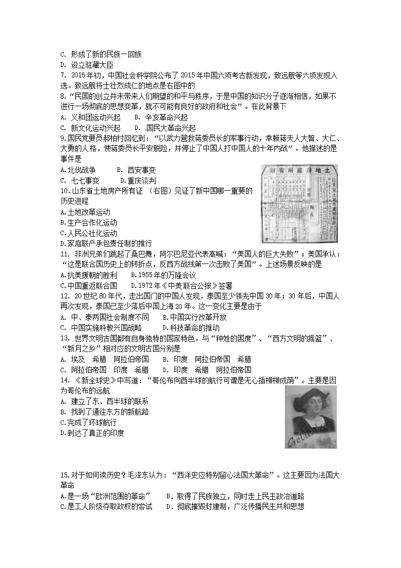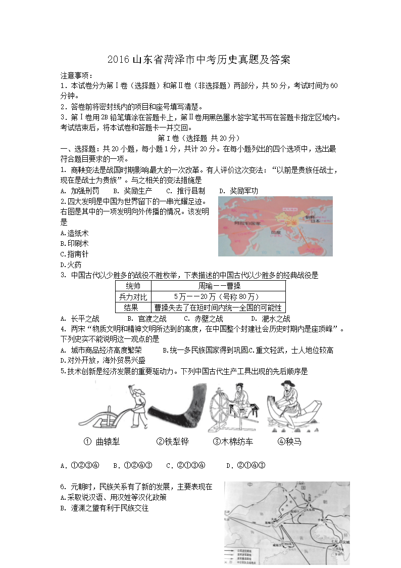 【文档名称】 2016山东省菏泽市中考历史真题及答案(Word版).doc