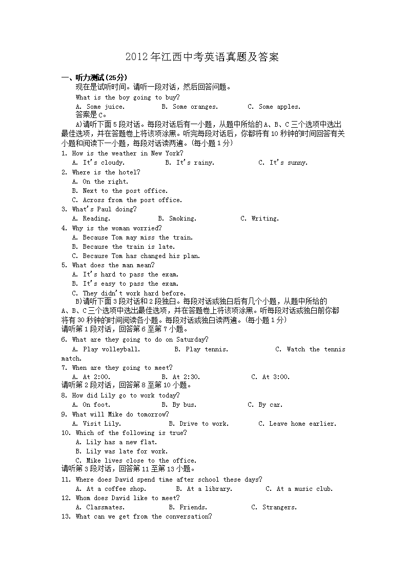 【文档名称】 2012年江西中考英语真题及答案(Word版).doc
