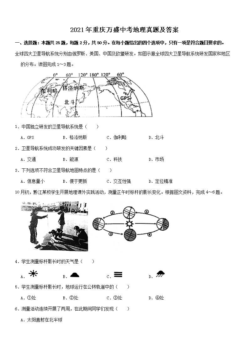 【文档名称】 2021年重庆万盛中考地理真题及答案(Word版).doc