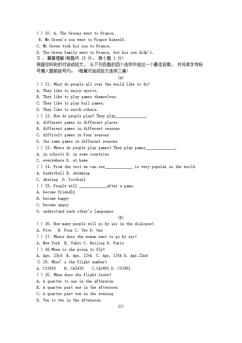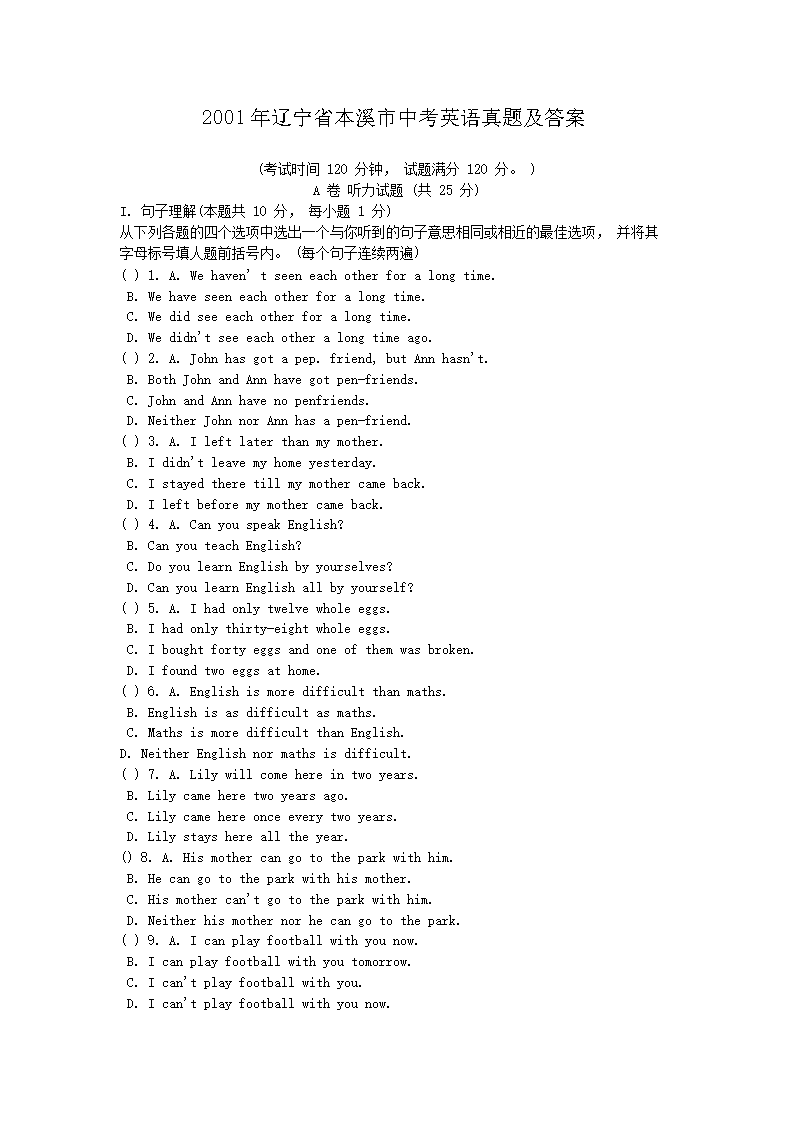 【文档名称】 2001年辽宁省本溪市中考英语真题及答案(Word版).doc