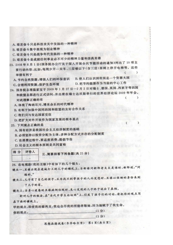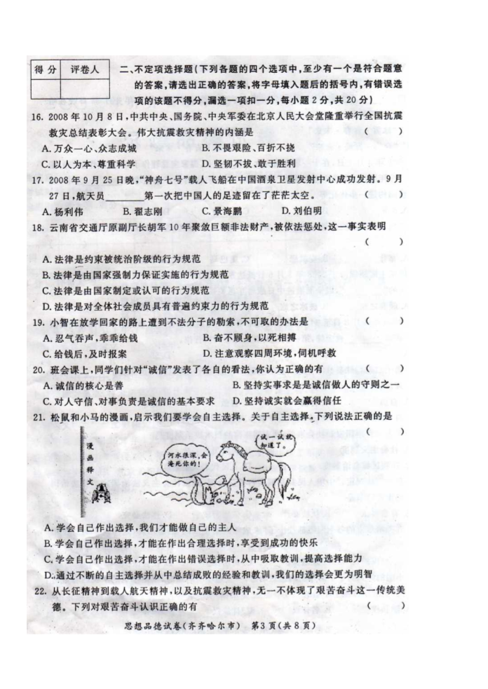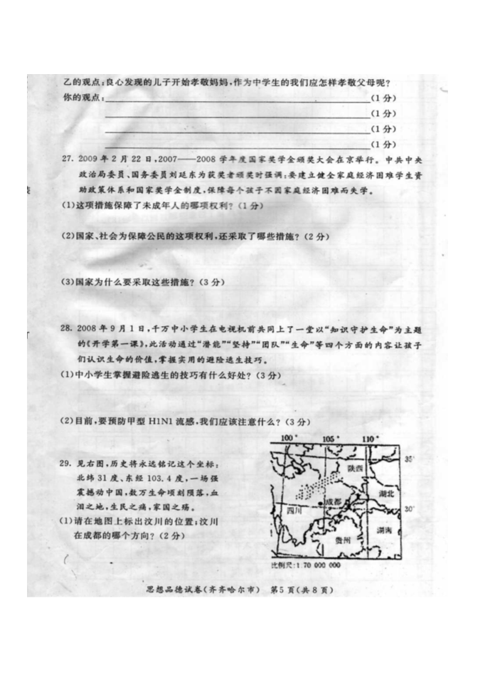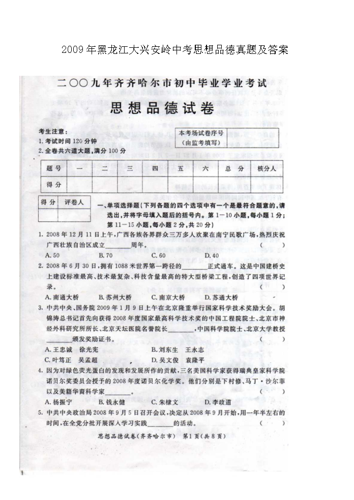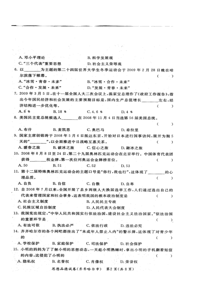 【文档名称】 2009年黑龙江大兴安岭中考思想品德真题及答案(图片版).doc