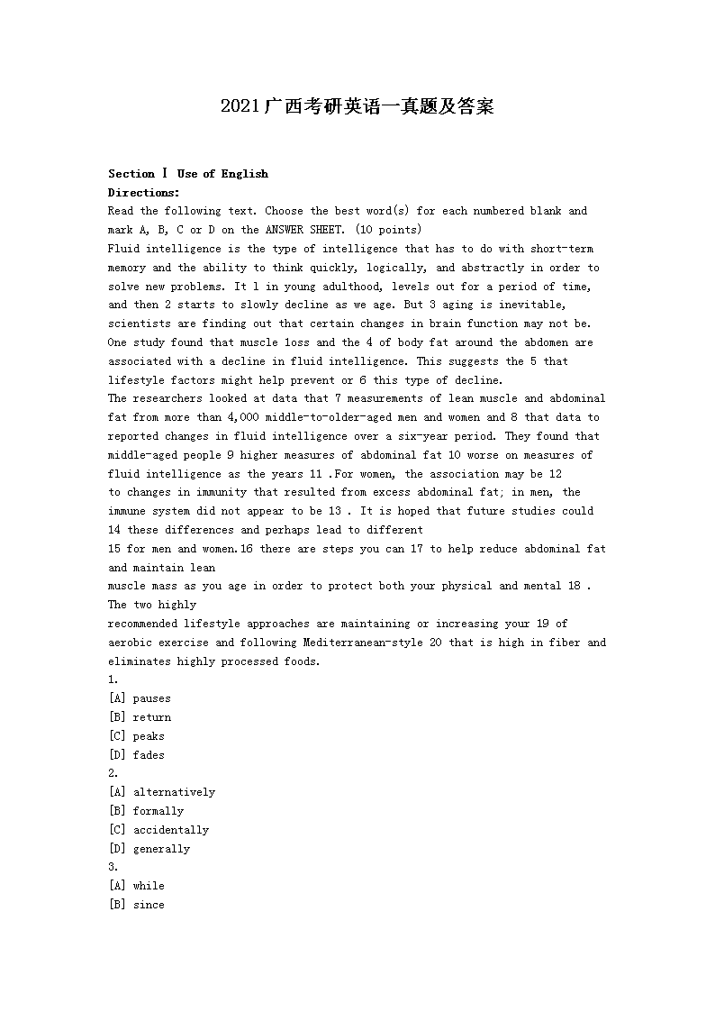 【文档名称】 2021广西考研英语一真题及答案(Word版).doc