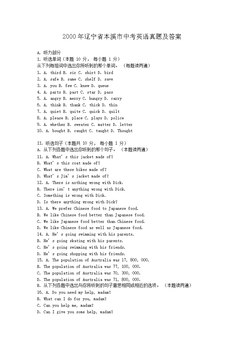 【文档名称】 2000年辽宁省本溪市中考英语真题及答案(Word版).doc