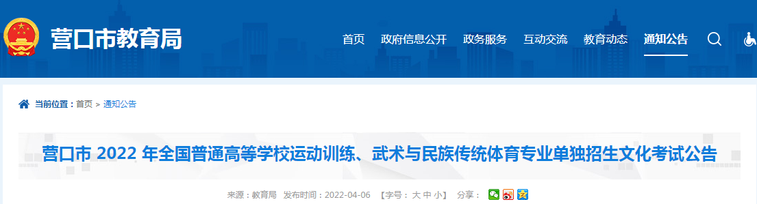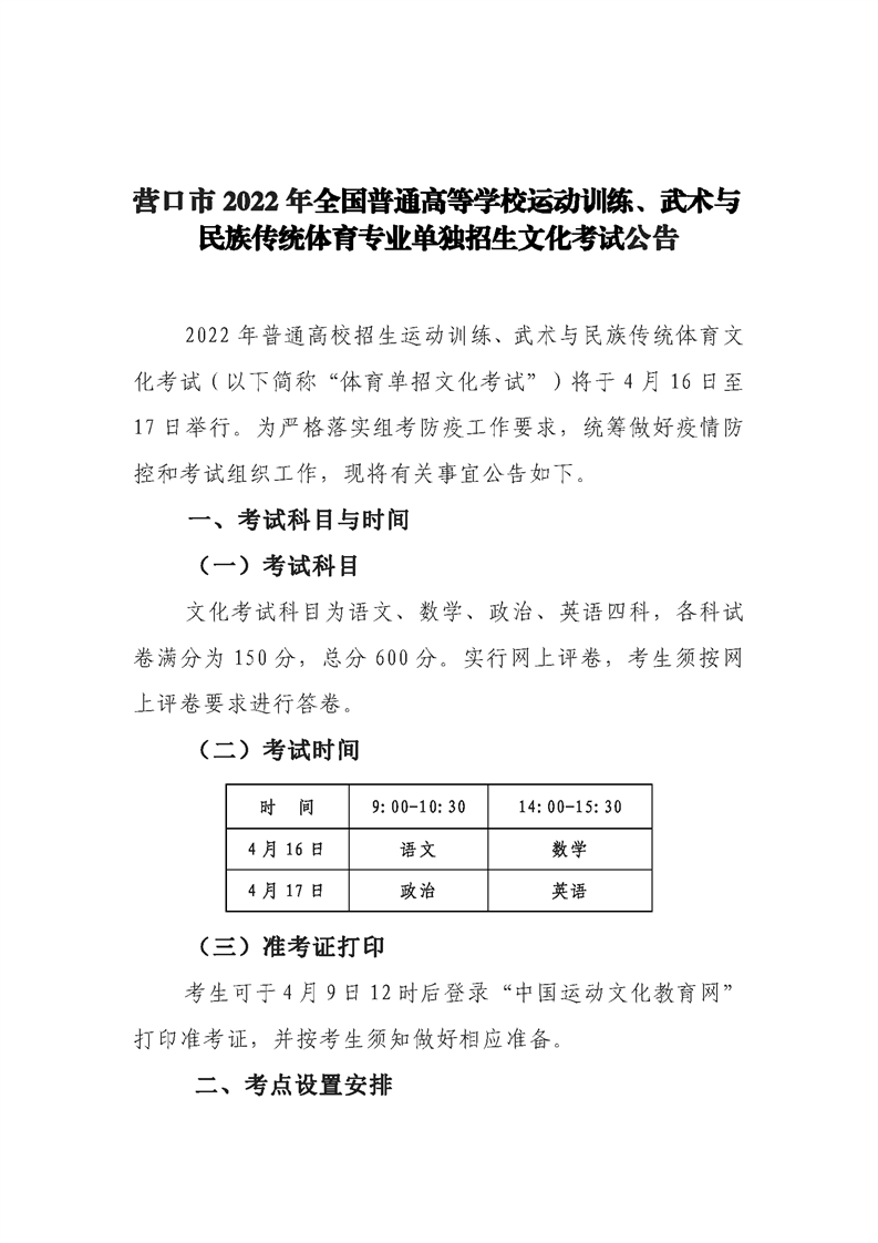 考网体育高考频道从营口市教育局了解到,辽宁营口2022年全国普通高等学校运动训练、武术与民族传统体育专业单独招生文化考试公告已发布,详情如下: