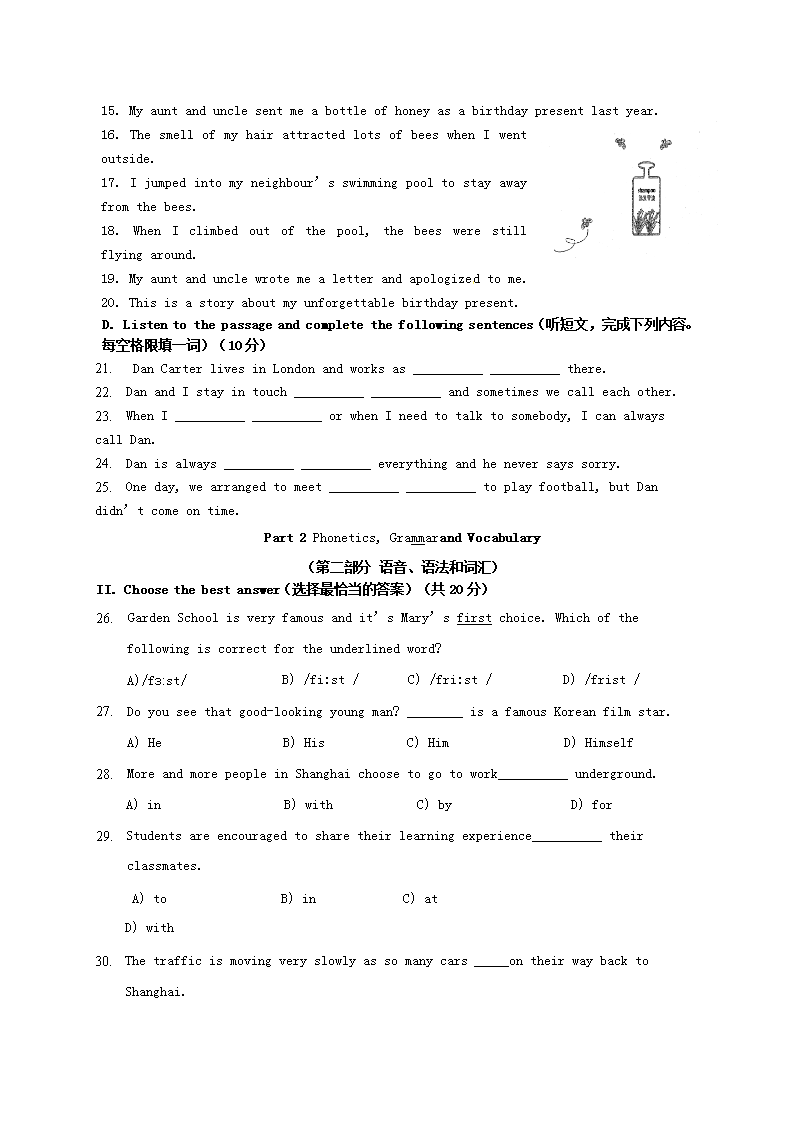 【文档名称】 2014年上海徐汇中考英语真题及答案(Word版).doc