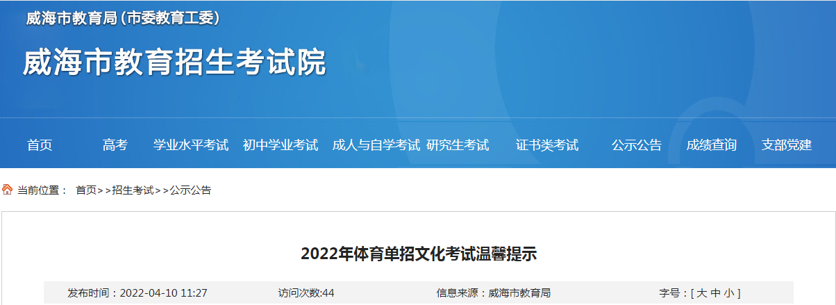 山东省2022年全国普通高等学校运动训练、武术与民族传统体育专业招生文化考试(以下简称“体育单招文化考试”)将于4月16-17日进行,现将考试安排及有关要求提示如下。