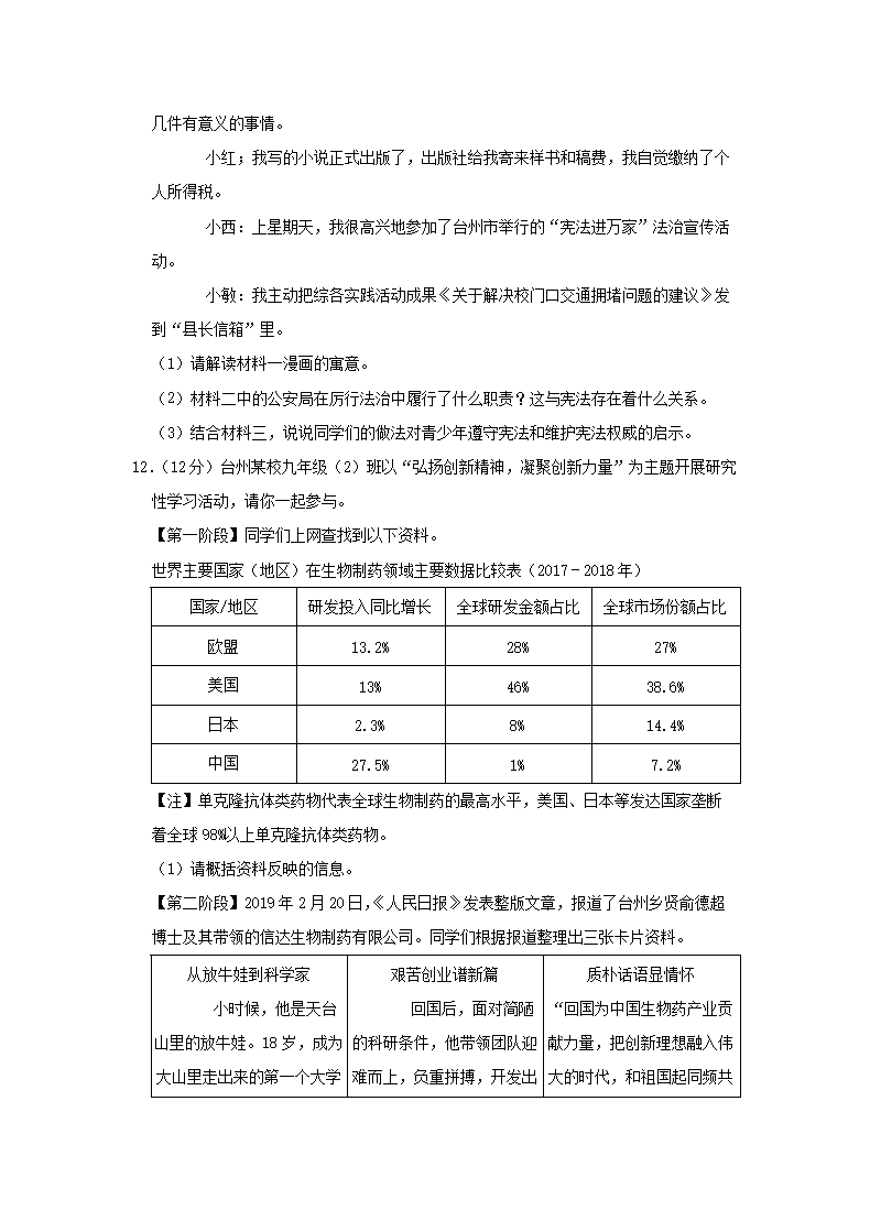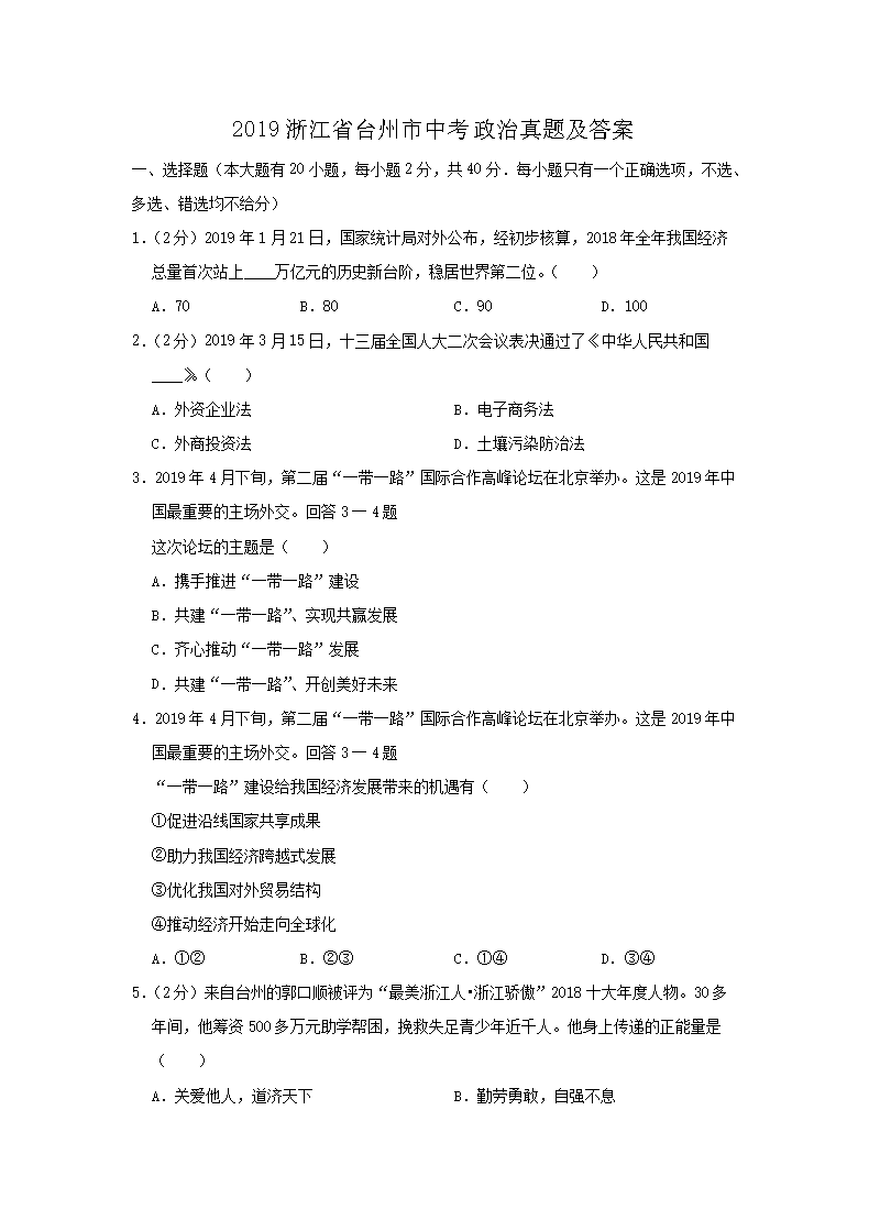 【文档名称】 2019浙江省台州市中考政治真题及答案(Word版).doc