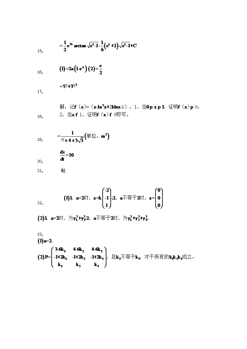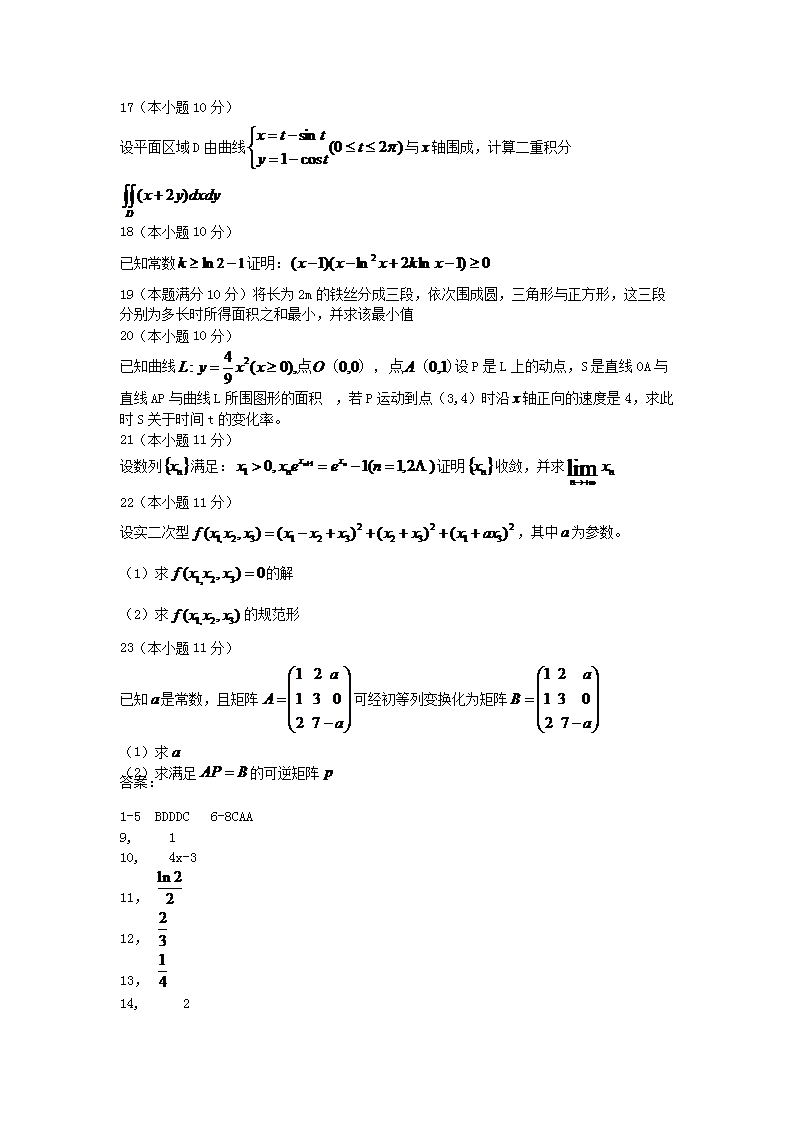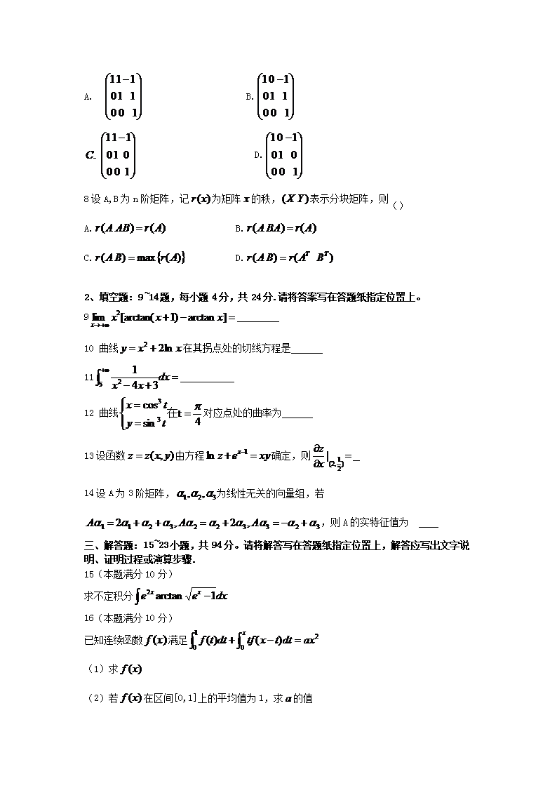 【文档名称】 2018河南考研数学二真题及答案(Word版).doc