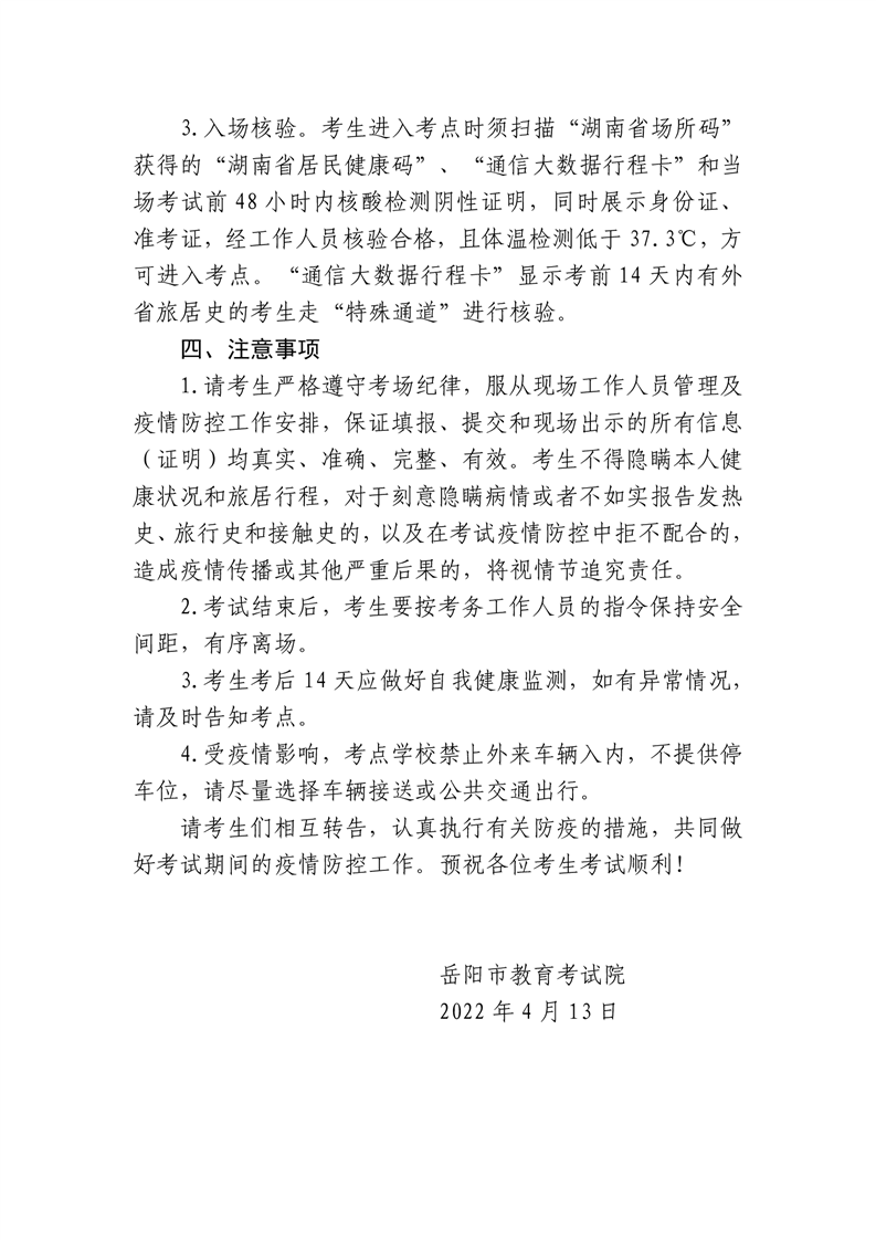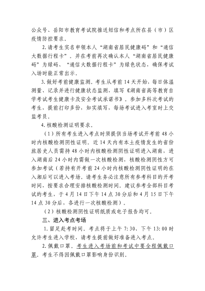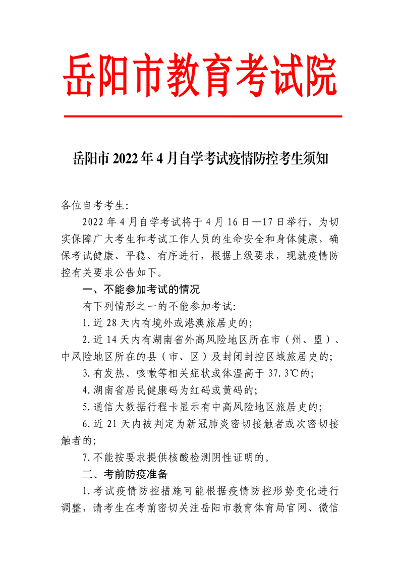 湖南岳阳2022年4月自学考试疫情防控考生须知