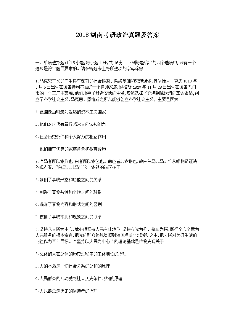 【文档名称】 2018湖南考研政治真题及答案(Word版).doc