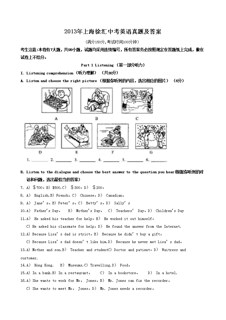 【文档预览】 无忧考网整理发布2013年上海徐汇中考英语真题及答案(Word版),前五页预览如下:
