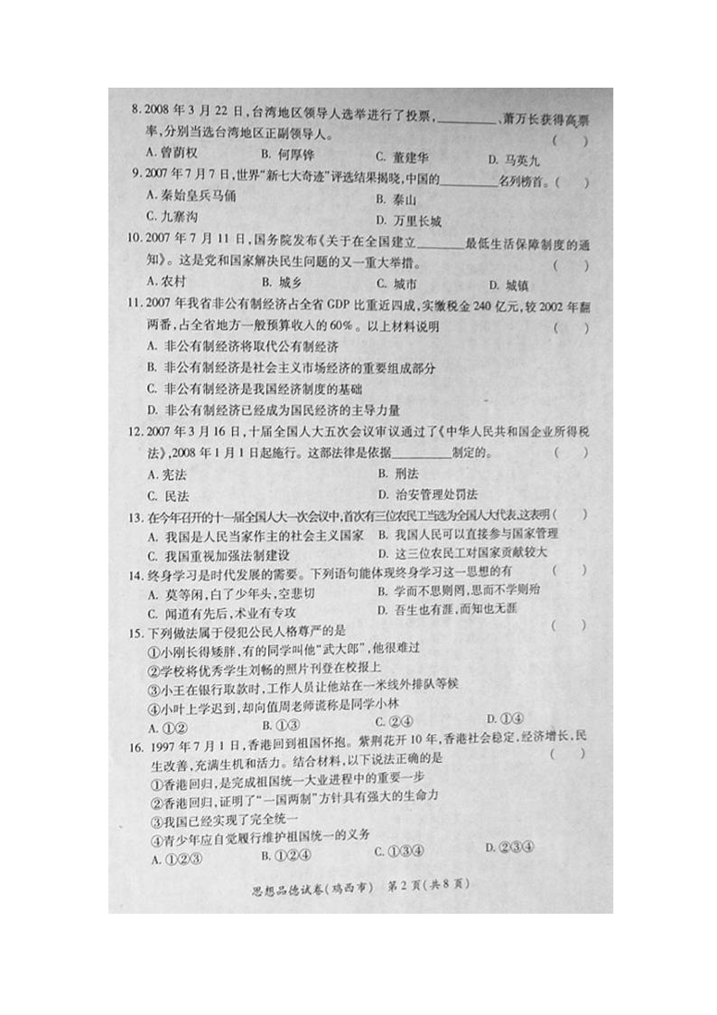 【文档名称】 2008年黑龙江七台河中考思想品德真题及答案(图片版).doc