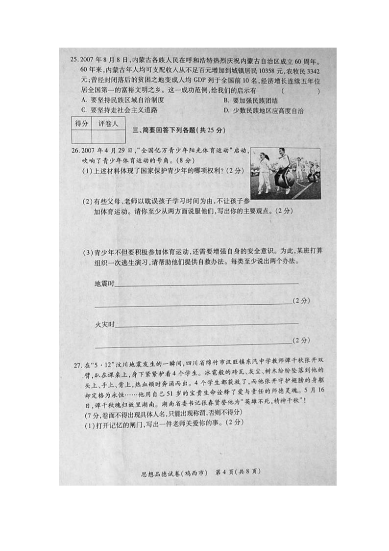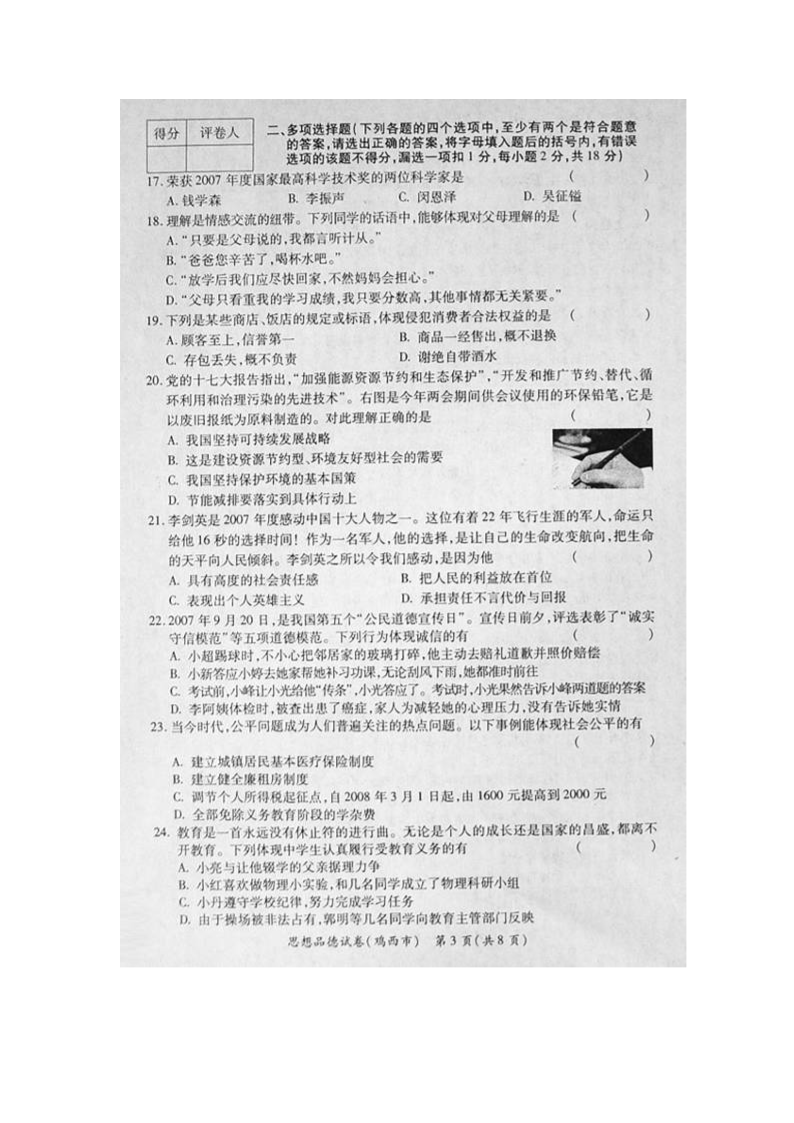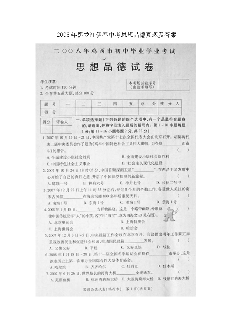 【文档名称】 2008年黑龙江伊春中考思想品德真题及答案(图片版).doc