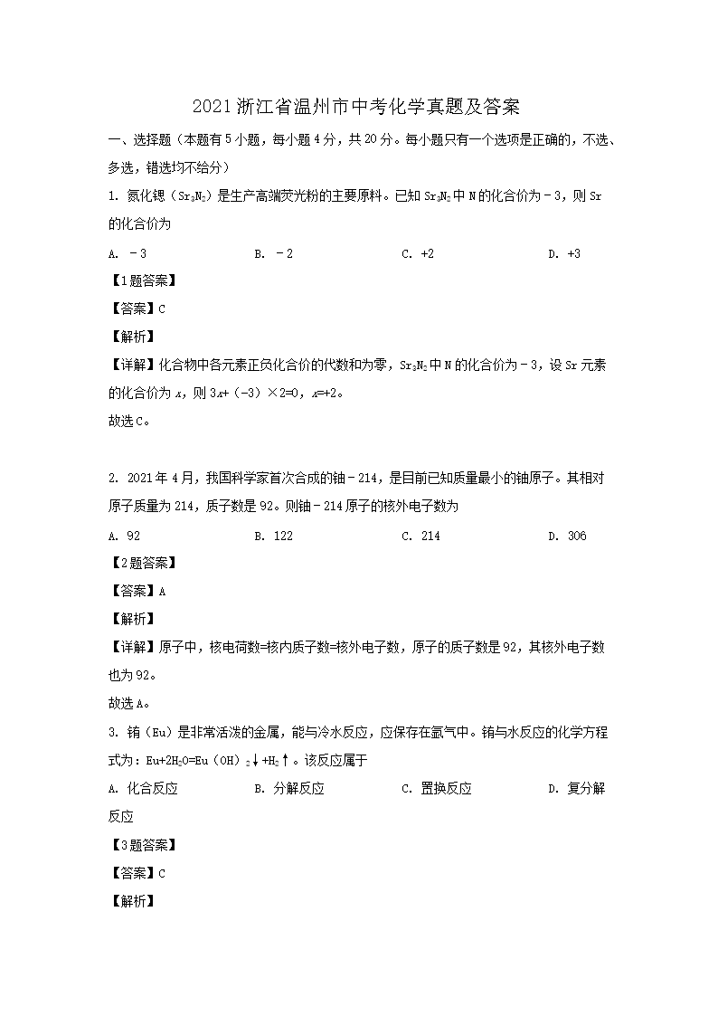 【文档预览】 无忧考网整理发布2021浙江省温州市中考化学真题及答案(Word版),前五页预览如下: