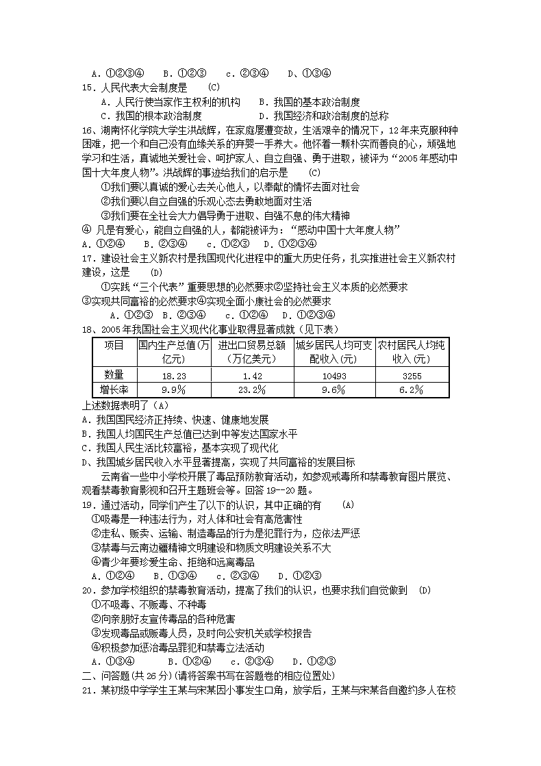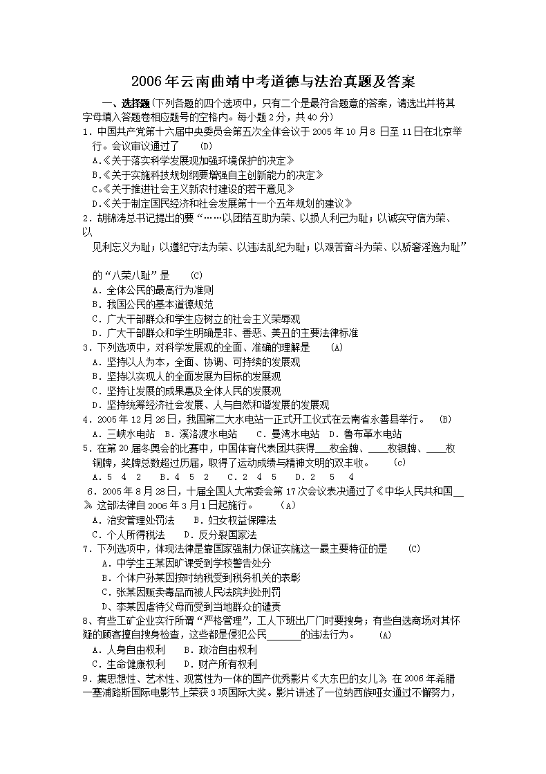 【文档名称】 2006年云南曲靖中考道德与法治真题及答案(Word版).doc