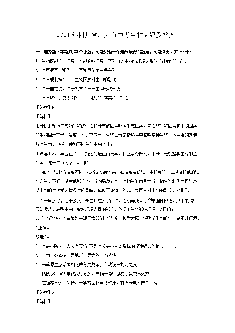 【文档预览】 无忧考网整理发布2021年四川省广元市中考生物真题及答案(Word版),前五页预览如下: