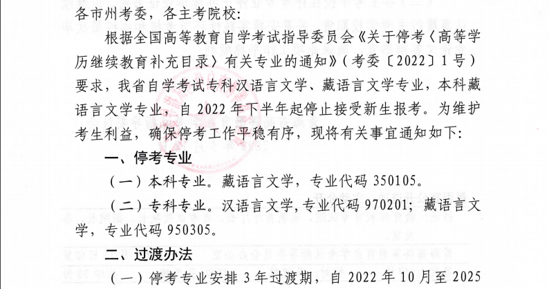 考网自考频道从青海省教育考试网了解到,2022下半年青海省关于停考自学考试有关专业的通知已发布,详情如下: