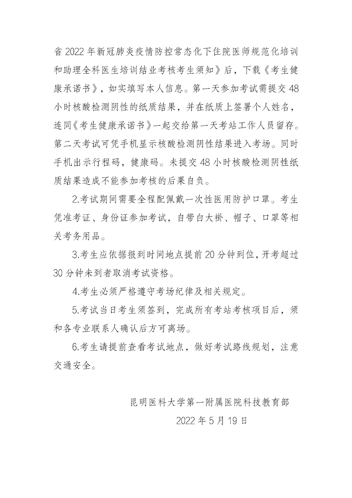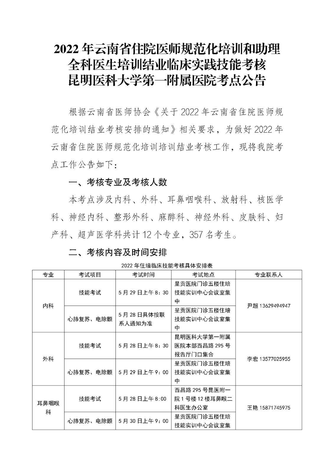 2022云南医科大学第一附属医院住院医师培训和助理全科医生结业临床实践技能考点公告