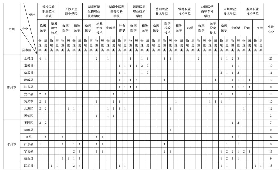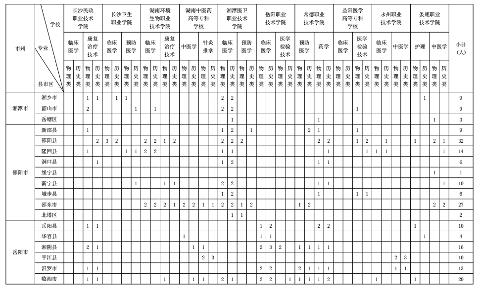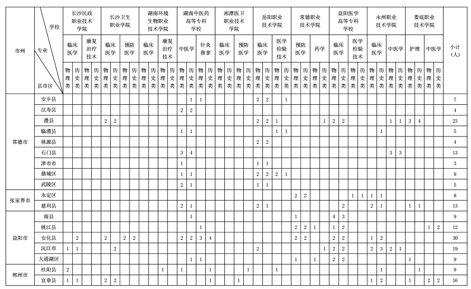 根据区域卫生人才发展规划和各地实际需求,省卫生健康委、省教育厅在综合平衡的基础上,编制了《2022年湖南省基层医疗卫生机构本土化专科层次人才培养分学校分类别分县市区招生来源计划表》(见附件)。