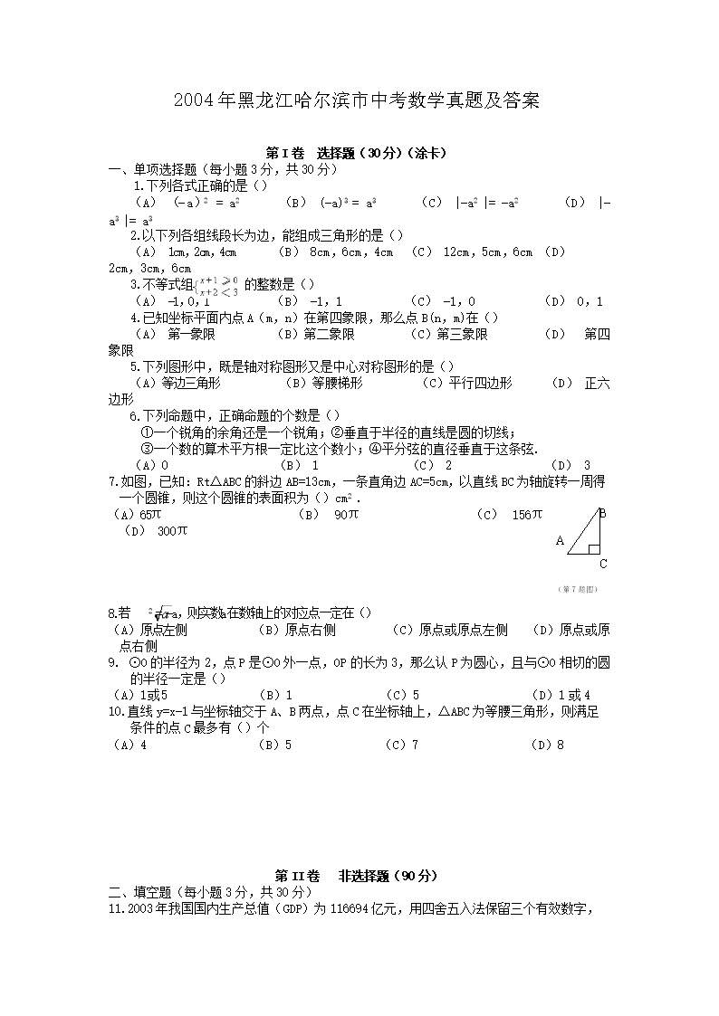 【文档名称】 2004年黑龙江哈尔滨市中考数学真题及答案(Word版).doc