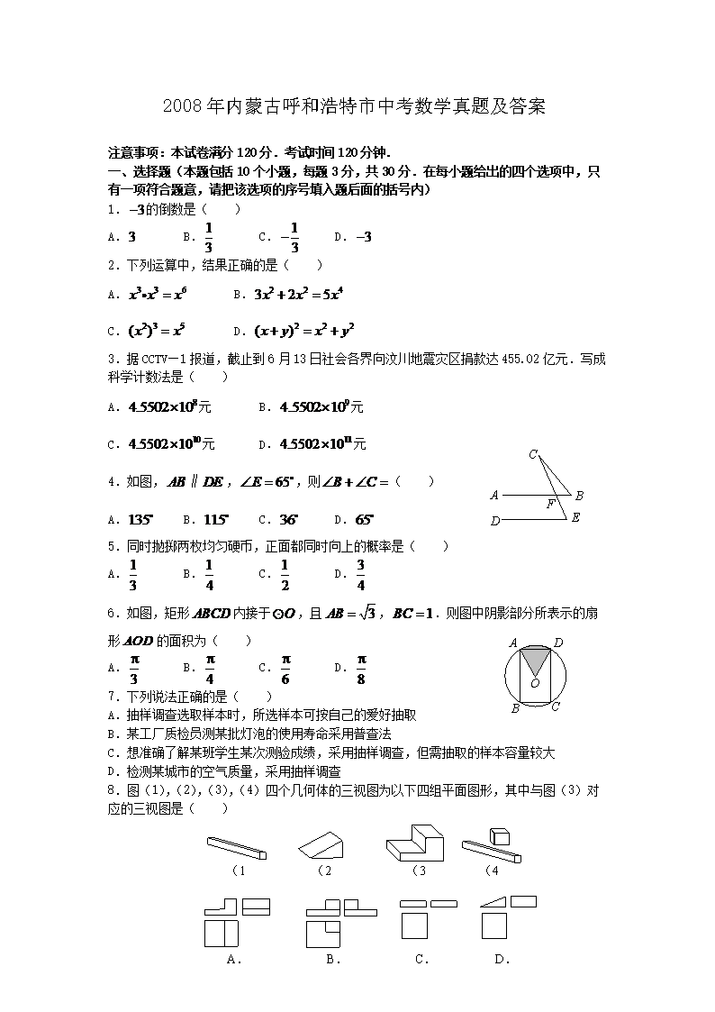 【文档名称】 2008年内蒙古呼和浩特市中考数学真题及答案(Word版).doc
