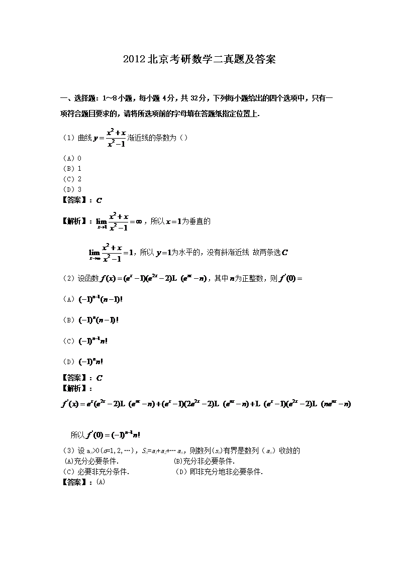 【文档名称】 2012北京考研数学二真题及答案(Word版).doc