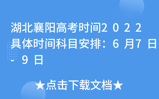 【#高考# #湖北襄阳高考时间2022具体时间科目安排:6月7日-9日#】©无忧考网从湖北省教育考试院发布的《2022年湖北普通高考考试安排及温馨提醒》得知,湖北襄阳高考时间2022具体时间科目安排已公布,6月7日-9日举行考试,具体详情如下: