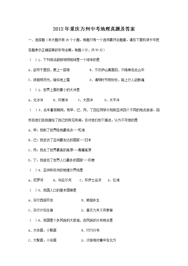 【文档预览】 无忧考网整理发布2012年重庆万州中考地理真题及答案(Word版),前五页预览如下: