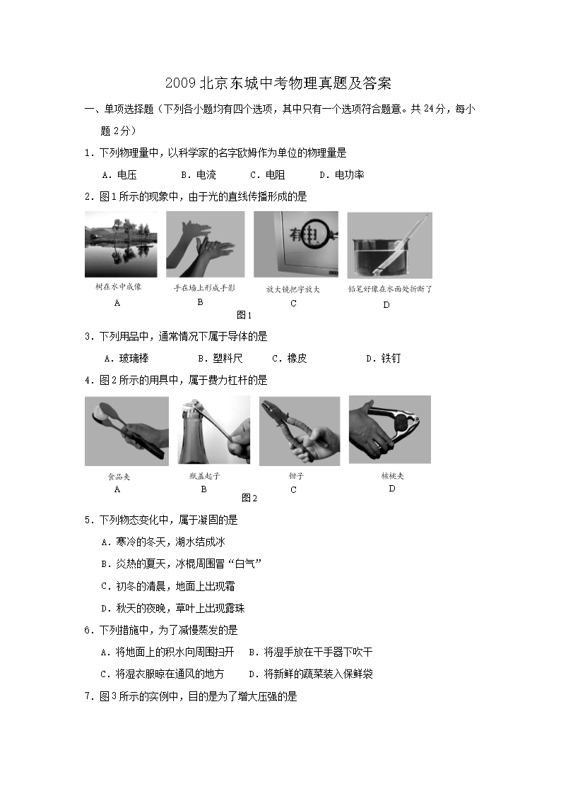 【文档预览】 无忧考网整理发布2009北京东城中考物理真题及答案(Word版),前五页预览如下: