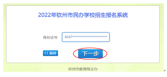 (二)系统自动根据学生身份证号码识别学生是否属于钦州市户籍,如果学生为钦州市户口而系统提示为非本市身份证号,请家长填报完信息后带上户籍材料在6月13日-15日到钦州市教育局现场审核。