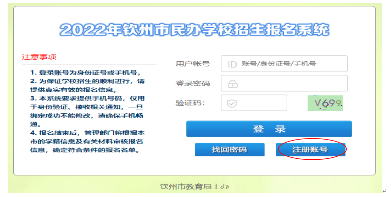 打开浏览器,进入钦州市教育局网站(http://jyj.qinzhou.gov.cn),在首页处单击“钦州市民办学校招生报名系统”图标,进入登录界面。