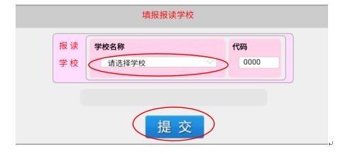 下拉菜单选择学校名称,代码自动填充,点击“提交”确认报读信息。