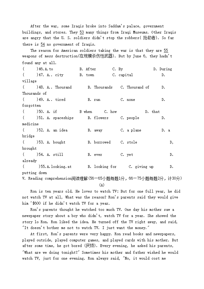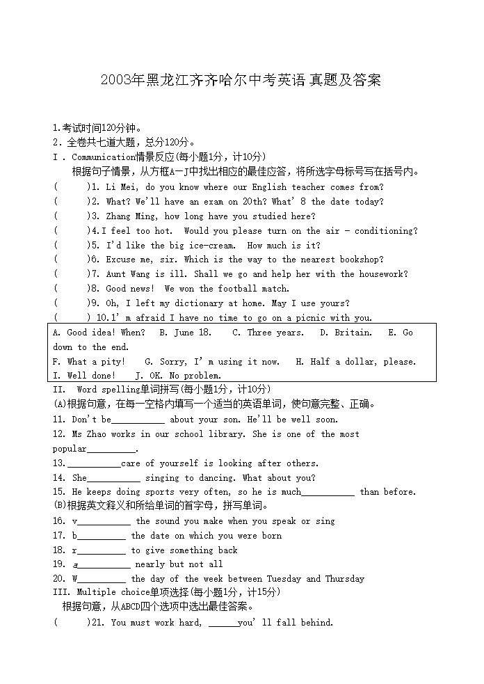 【文档名称】 2003年黑龙江齐齐哈尔中考英语真题及答案(Word版).doc
