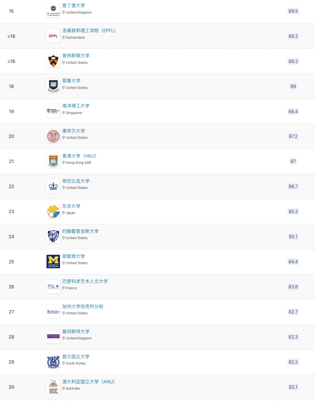 当然,虽然很多美国大学排名下跌,但斯坦福大学(3)、芝加哥大学(10)、宾夕法尼亚大学(13)、普林斯顿大学(16)、耶鲁大学(18)以及康奈尔大学(20)仍保持在了世界前20行列。