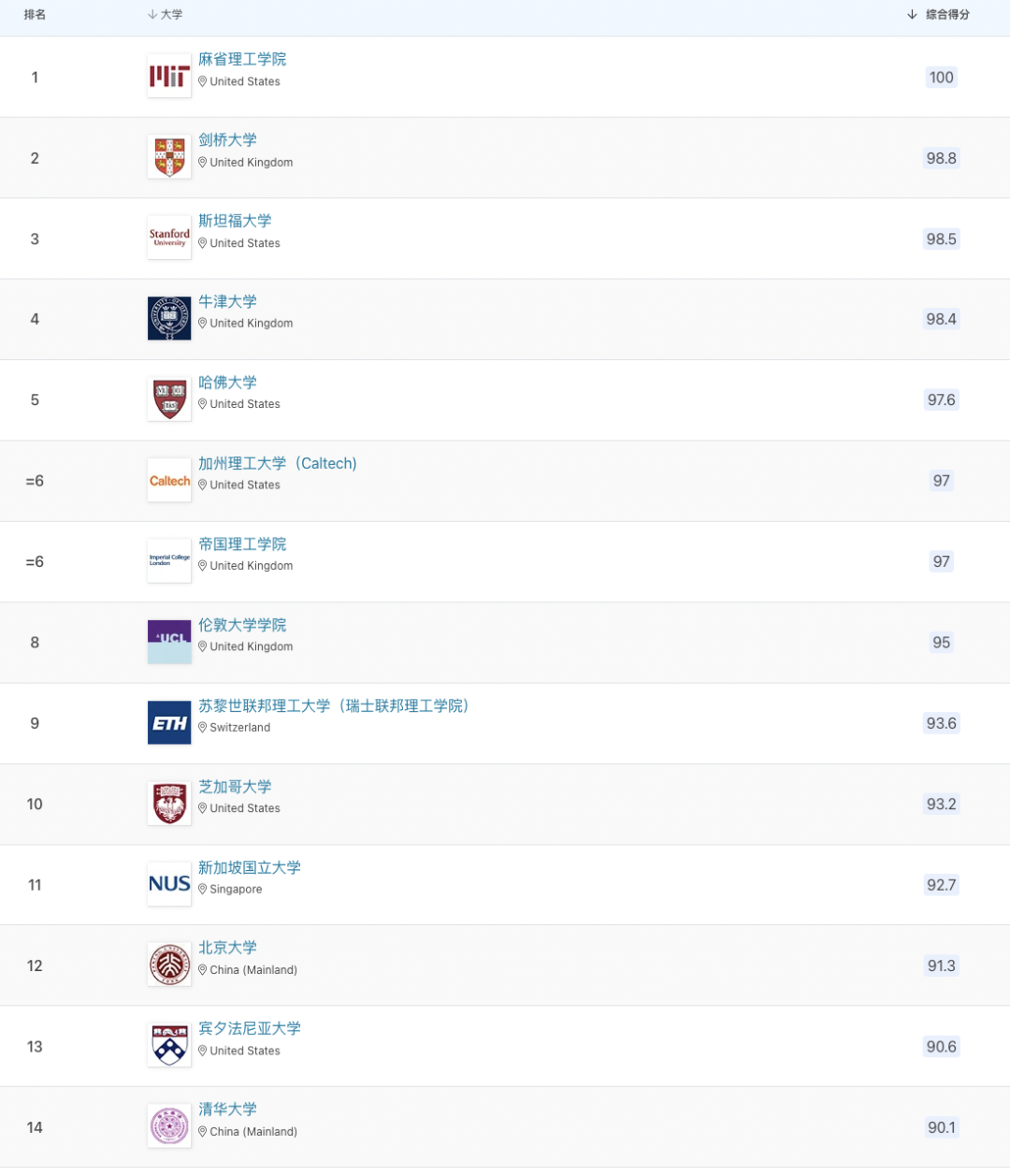 麻省理工学院连续第十一年创纪录地位列世界第一。剑桥大学上升至第二位,斯坦福大学仍位居第三位。新加坡国立大学是亚洲表现的大学,连续第五年位居世界第11位。中国(大陆)目前有两所大学进入世界前15名,北京大学(第12名)和清华大学(第14名)获得了本榜单成立以来的排名。瑞士苏黎世联邦理工学院(世界排名第9位)仍为欧洲大陆排名,而布宜诺斯艾利斯大学(UBA)继续在拉丁美洲。