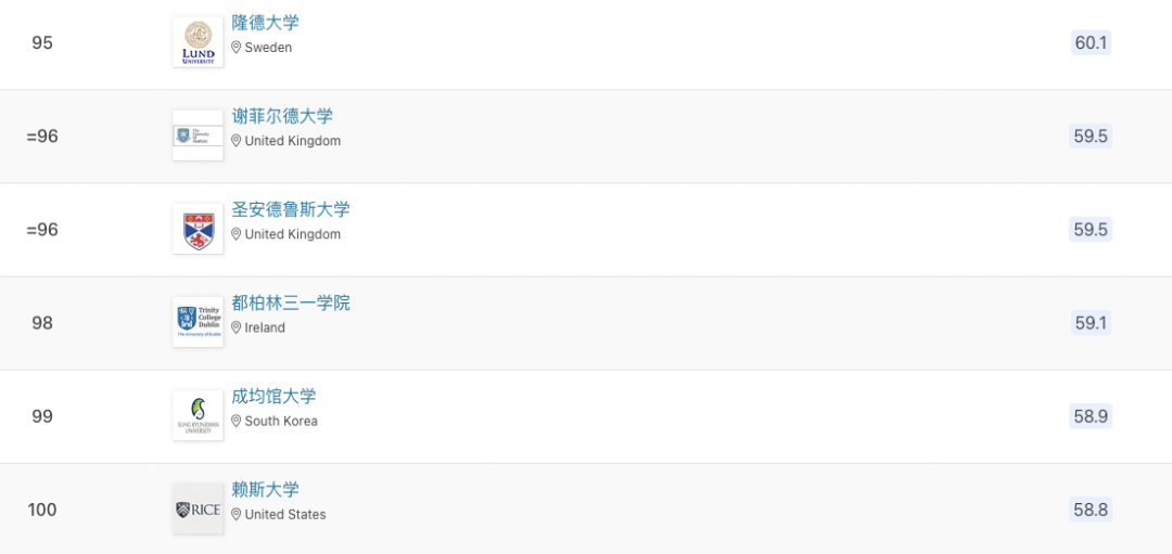 除以上大学以外,伦敦政治经济学院、华威大学、格拉斯哥大学、南安普顿大学、伯明翰大学、谢菲尔德大学、杜伦大学以及圣安德鲁斯大学也均保持在了世界前100高校的行列。