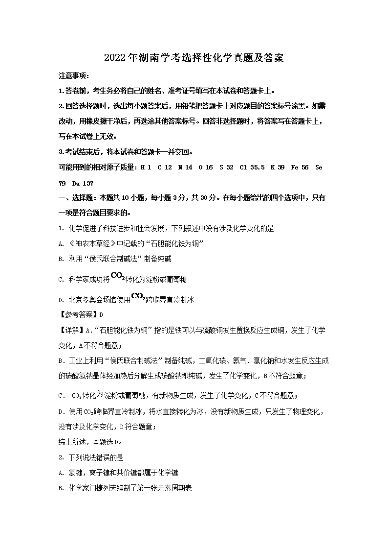【文档名称】 2022年湖南学考选择性化学真题及答案(Word版).doc