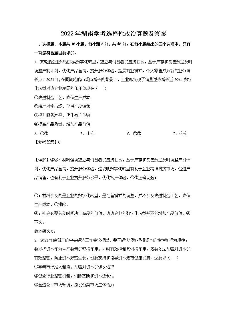 【文档名称】 2022年湖南学考选择性政治真题及答案(Word版).doc