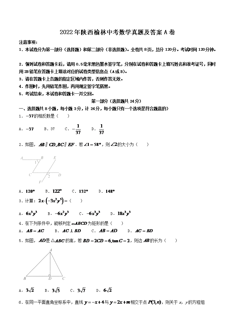 【文档名称】 2022年陕西榆林中考数学真题及答案A卷(Word版).doc