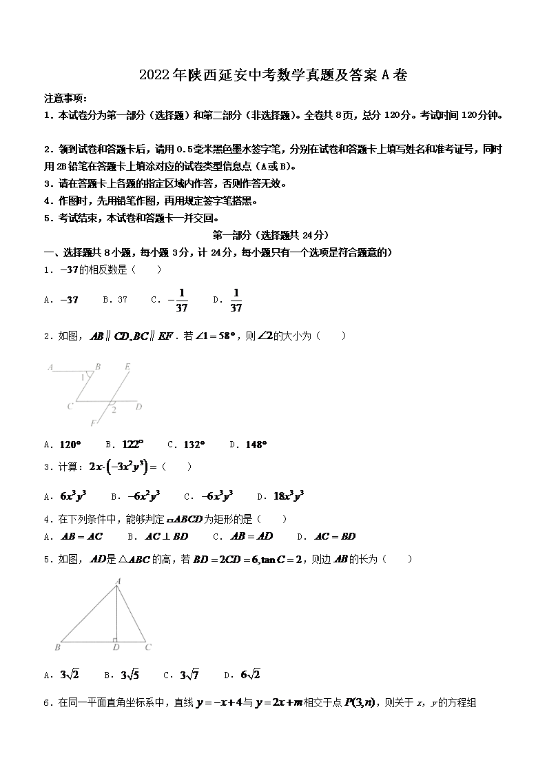 【文档名称】 2022年陕西延安中考数学真题及答案A卷(Word版).doc