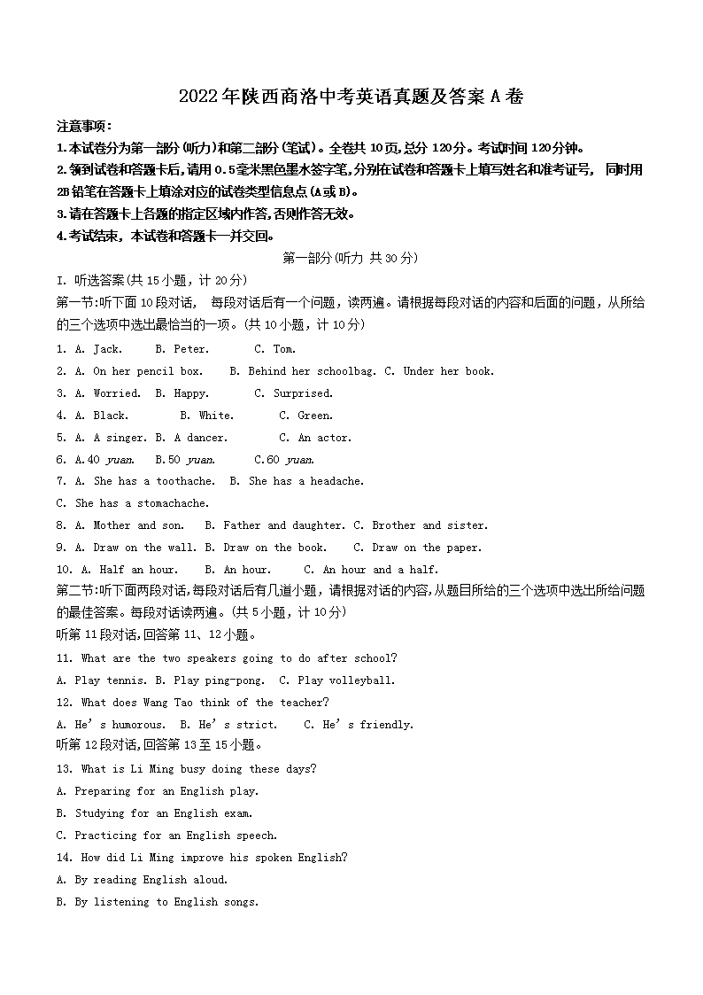 【文档名称】 2022年陕西商洛中考英语真题及答案A卷(Word版).doc