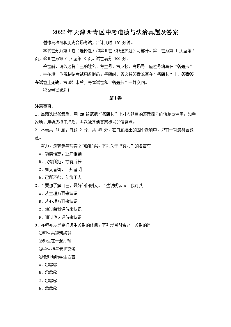 【文档预览】 无忧考网整理发布2022年天津西青区中考道德与法治真题及答案(Word版),前五页预览如下: