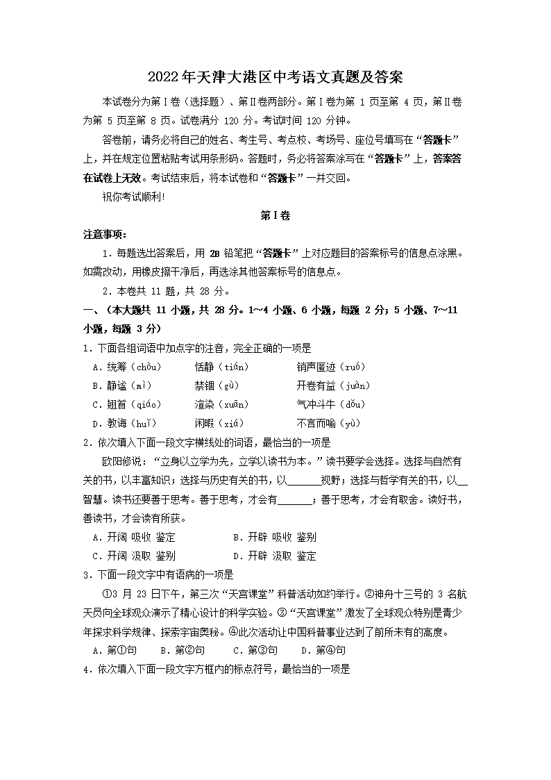 【文档名称】 2022年天津大港区中考语文真题及答案(Word版).doc