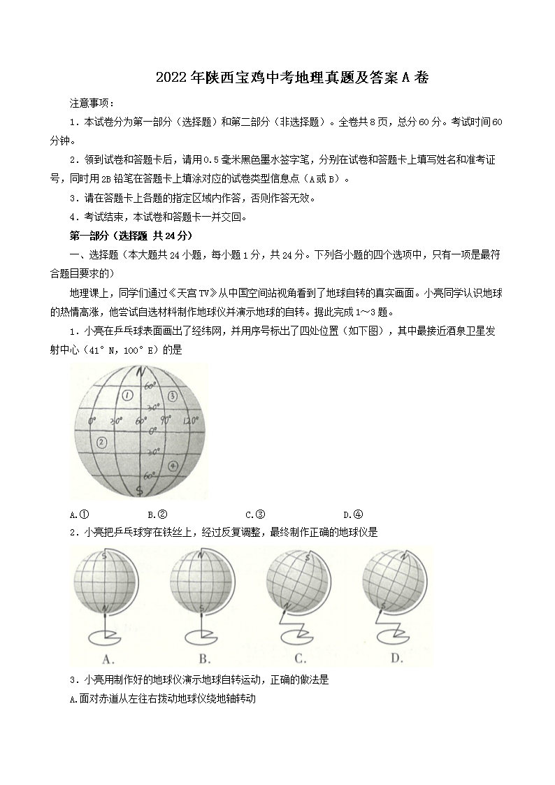 【文档名称】 2022年陕西宝鸡中考地理真题及答案A卷(Word版).doc