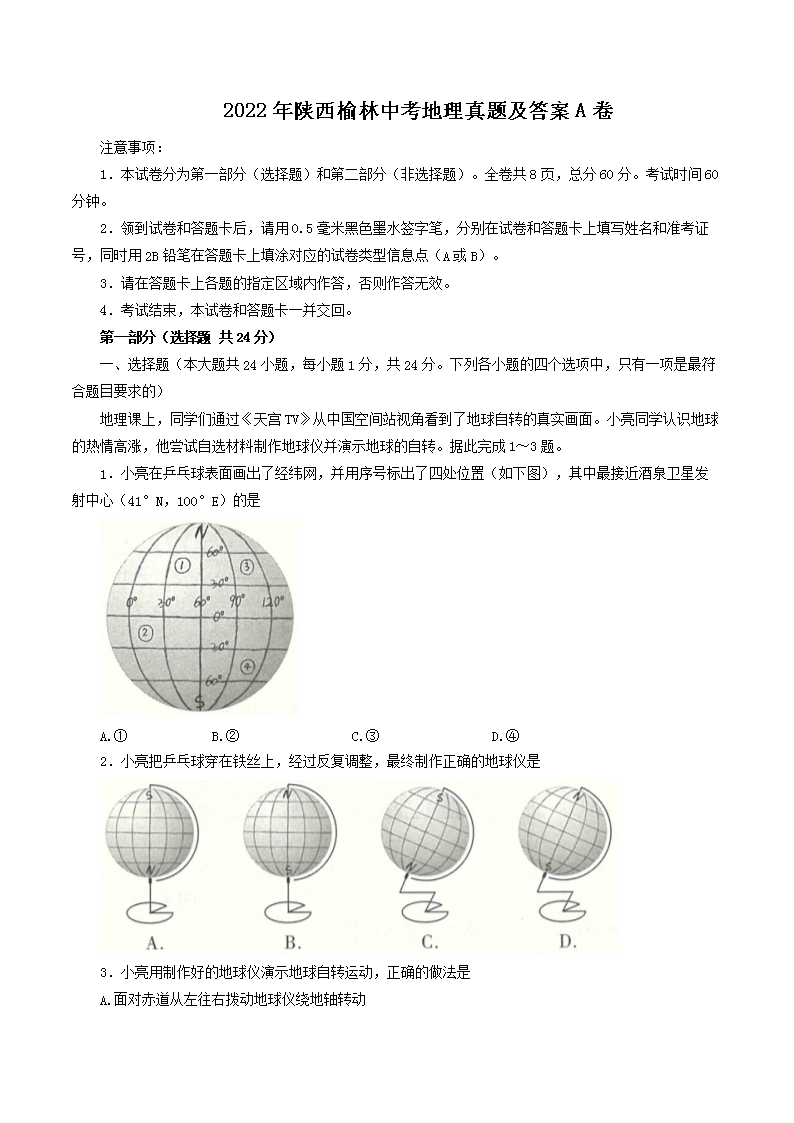 【文档名称】 2022年陕西榆林中考地理真题及答案A卷(Word版).doc
