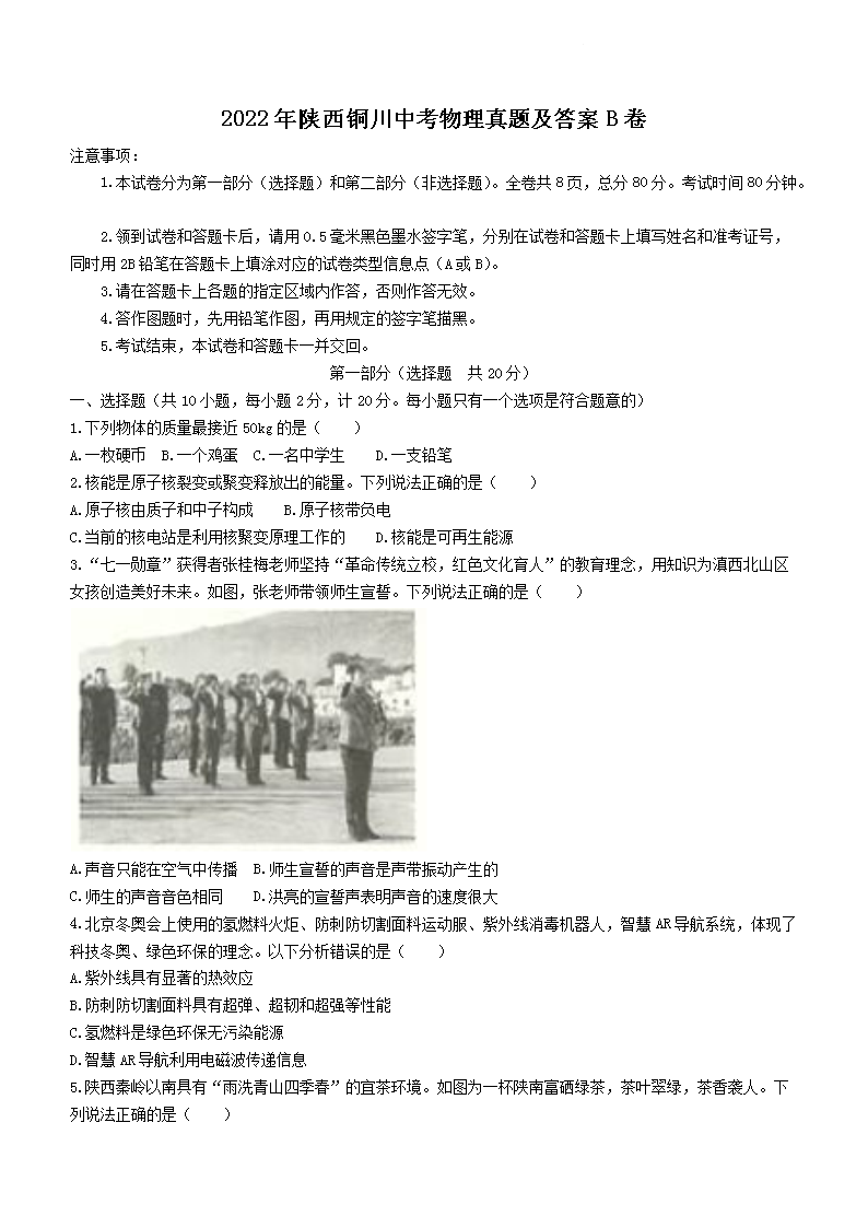【文档预览】 无忧考网整理发布2022年陕西铜川中考物理真题及答案B卷(Word版),前五页预览如下: