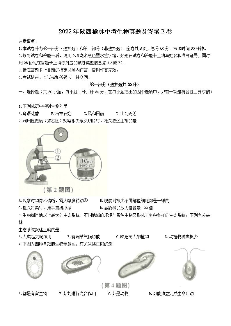 【文档预览】 无忧考网整理发布2022年陕西榆林中考生物真题及答案B卷(Word版),前五页预览如下: