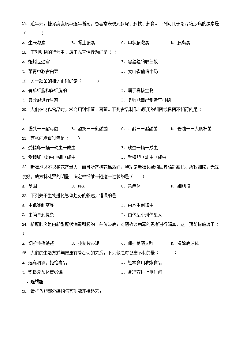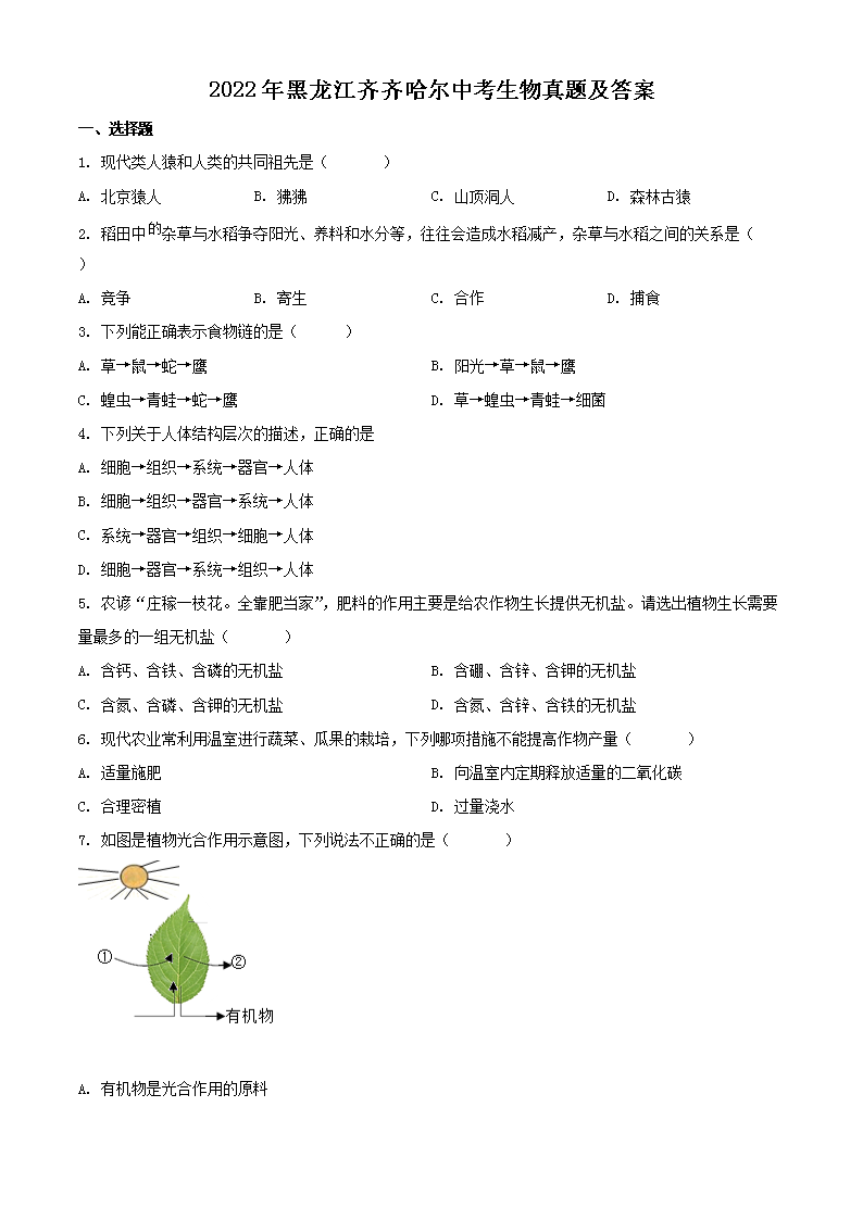 【文档名称】 2022年黑龙江齐齐哈尔中考生物真题及答案(Word版).doc